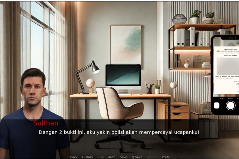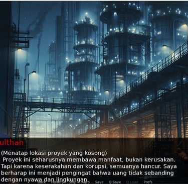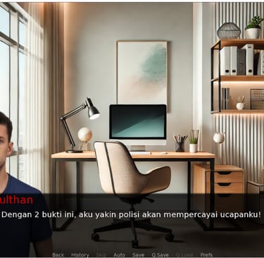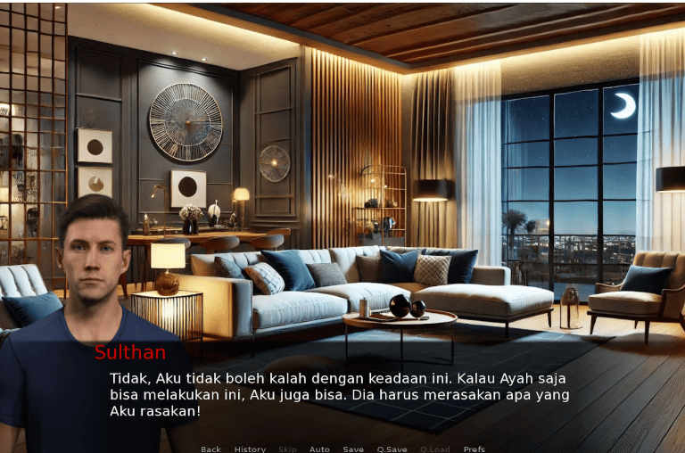 Story: Story game ini memiliki 4 ending dengan alur yang linear dan branching berdasarkan jumlah clue yang dimiliki. Story game ini mengikuti Sulthan yang mengalami penyakit kronis yang bersifat detrimental pada keselamatan sulthan. ketika Sulthan menjemput ayahnya, ia menemukan sesuatu… hal yang akan mengubah hubungannya dengan ayahnya selamanya. Story yang dibawa dari game ini menurut saya sangat menarik dan seru untuk dijalani, implikasi pada hubungan keluar yang datang dari investigasi lebih lanjut, perasaan dihianati, dan investigasi yang dilakukan seru dan sangat menarik serta menggugah rasa penasaran